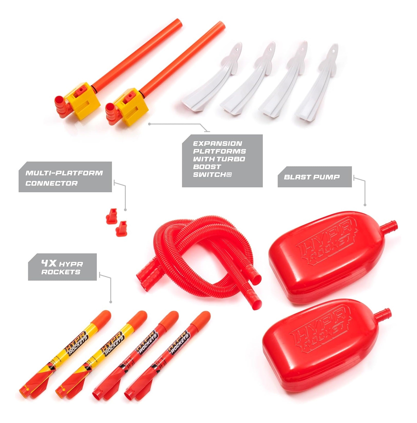 El cohete HYPR vuela más rápido, más lejos y más alto (150 metros) que cualquier otro cohete de juguete. La combinación de cohetes de presión y una plataforma de lanzamiento patentada garantiza un rendimiento superior y horas de diversión al aire libre. Reta a tus amigos a un duelo pisando simultáneamente el pedal de aire para que el cohete ascienda. ¡El último cohete en tocar el suelo gana!