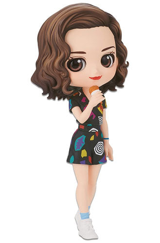 Esta figura Q posket muestra a Eleven de Stranger Things después de una aventura de compras en el centro comercial Starcourt, disfrutando de una bola de helado de Scoops Ahoy en la temporada 3.